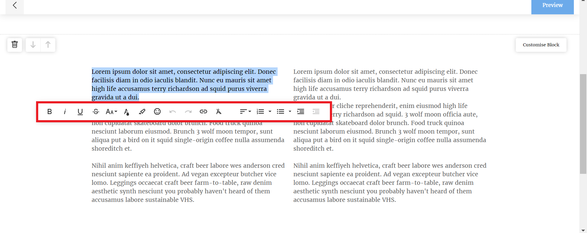 4. Edit the font and style of your text by highlighting it with your cursor, the menu will automatically appear and give you the options to change the font, format and positioning of the text, as shown in the example below.