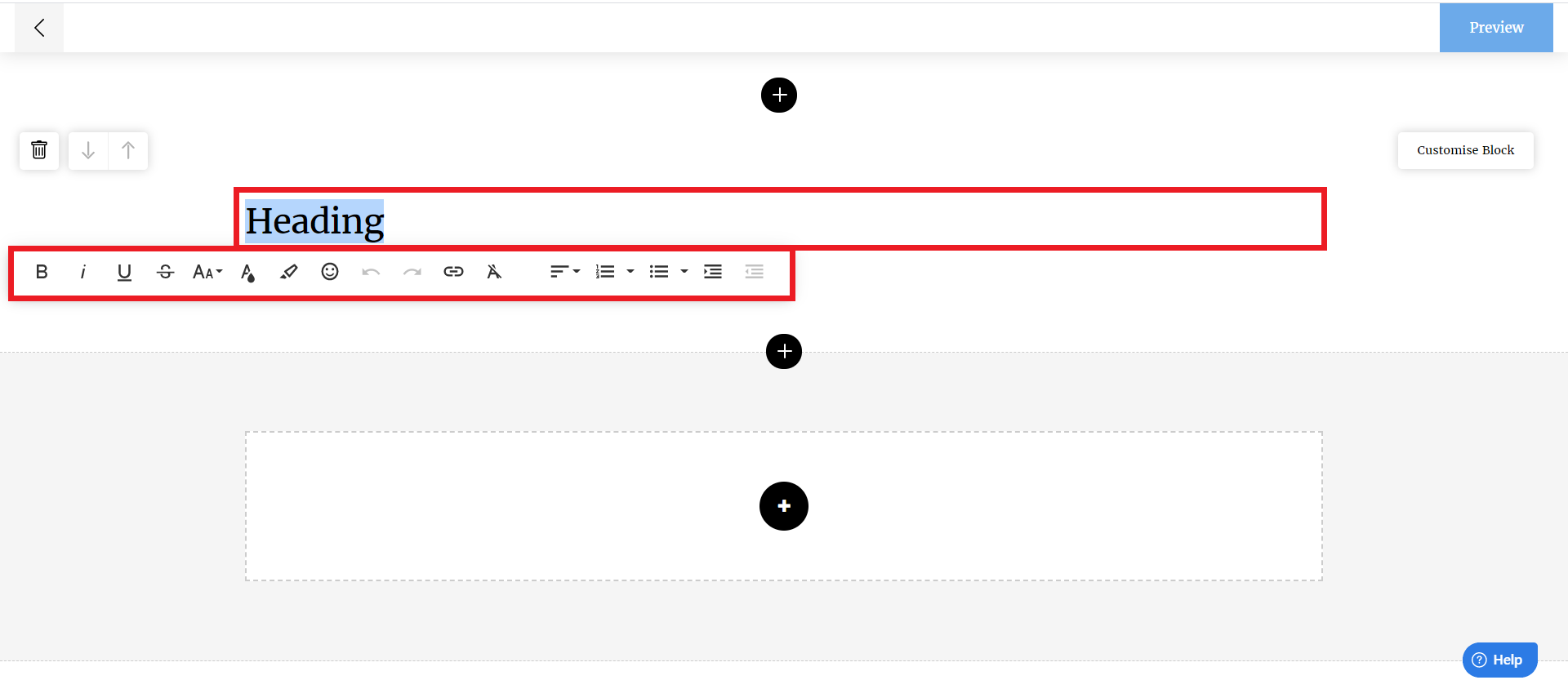 1. To add a heading click on one of the '+' buttons highlighted below.